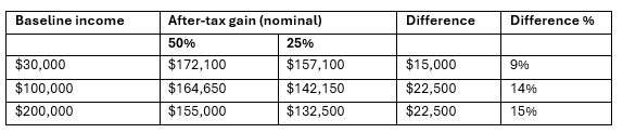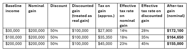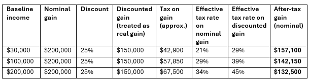 The table below shows how a $200k nominal gain and the 50% discount is applied to three different baseline incomes and the nominal amount that is retained by the investor.