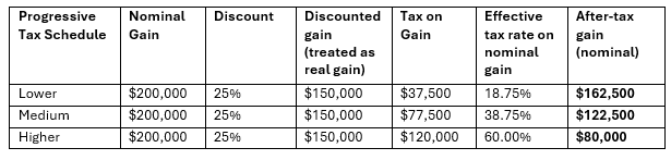 Tables 4 and 5 below show how a $200k nominal capital gain and a 25% discount, assuming this is a more accurate approximation of inflation, is used to calculate a discounted gain that is then taxed under three progressive options.